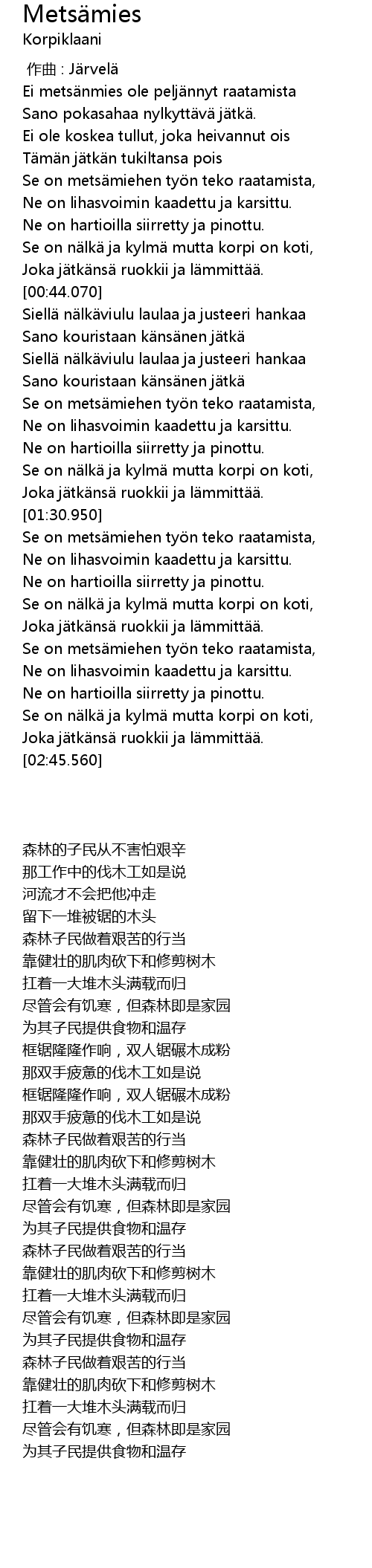 | [02:29.230] | Se on nälkä ja kylmä mutta korpi on koti, |