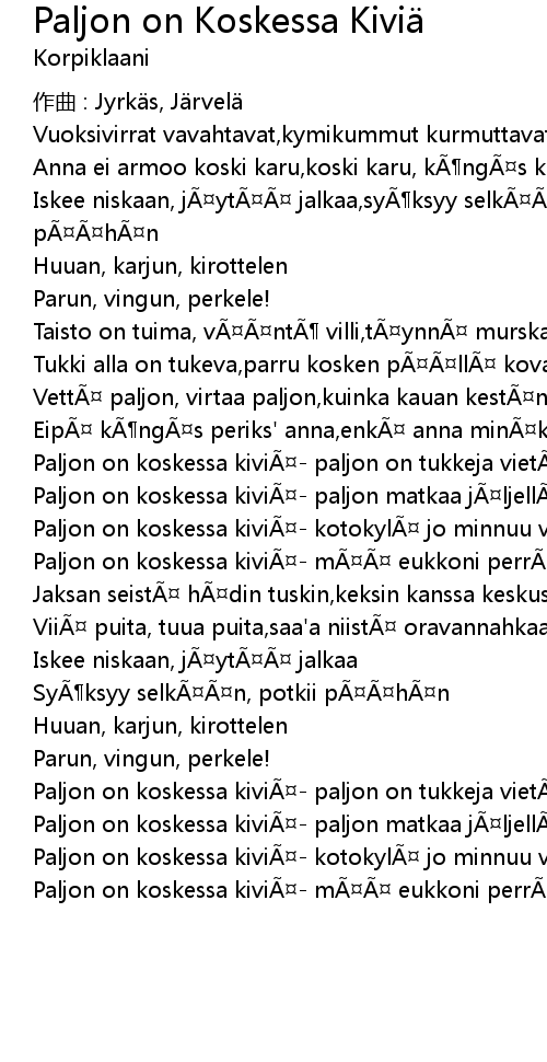 | Paljon on koskessa kiviä- mää eukkoni perrään jo kaipaan | |