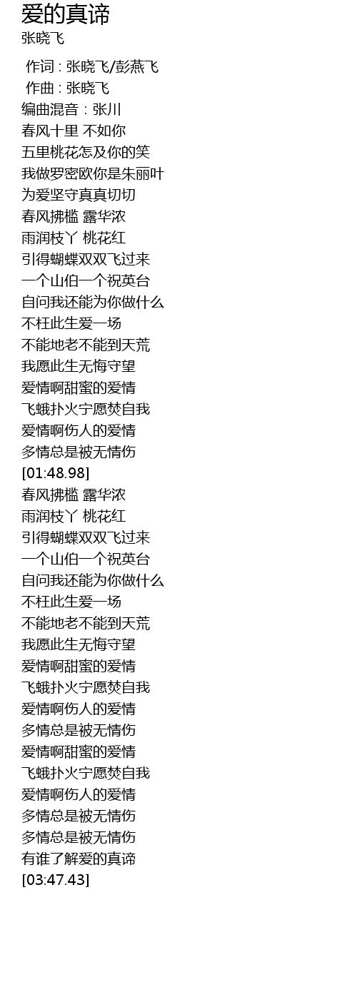 | [00:00.00] | 作词 : 张晓飞/彭燕飞 |