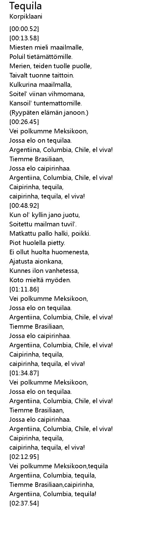 | [02:14.39] | Vei polkumme Meksikoon,tequila |
