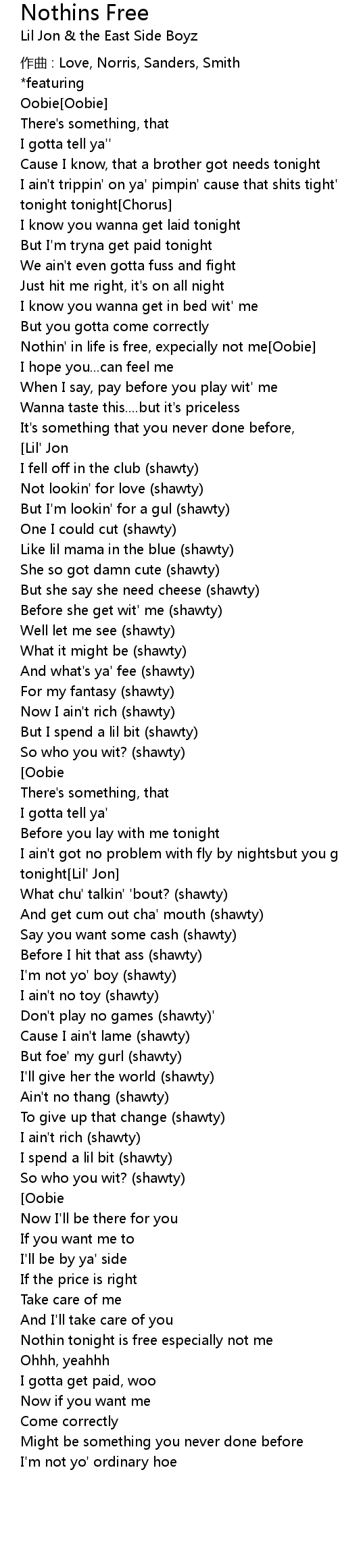 | Nothin' in life is free, expecially not me[Oobie] | |