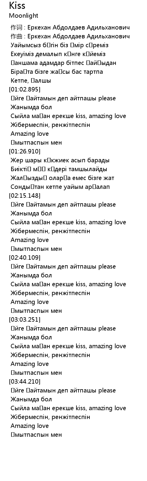 | [02:45.635] | Сыйла маған ерекше kiss, amazing love |