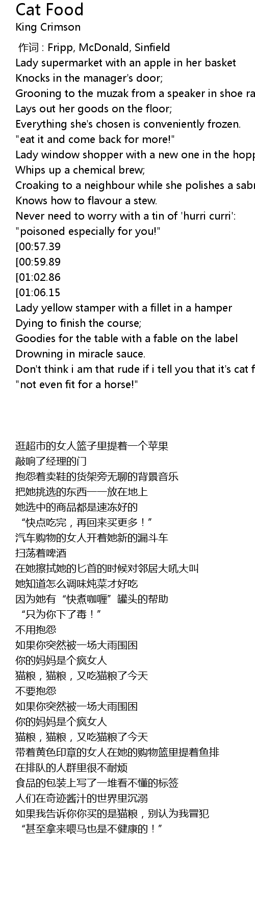 | [01:53.60][01:06.15] | Cat food cat food cat food again. |