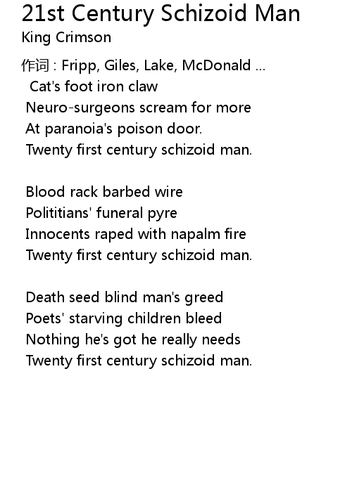 | Twenty first century schizoid man. | |