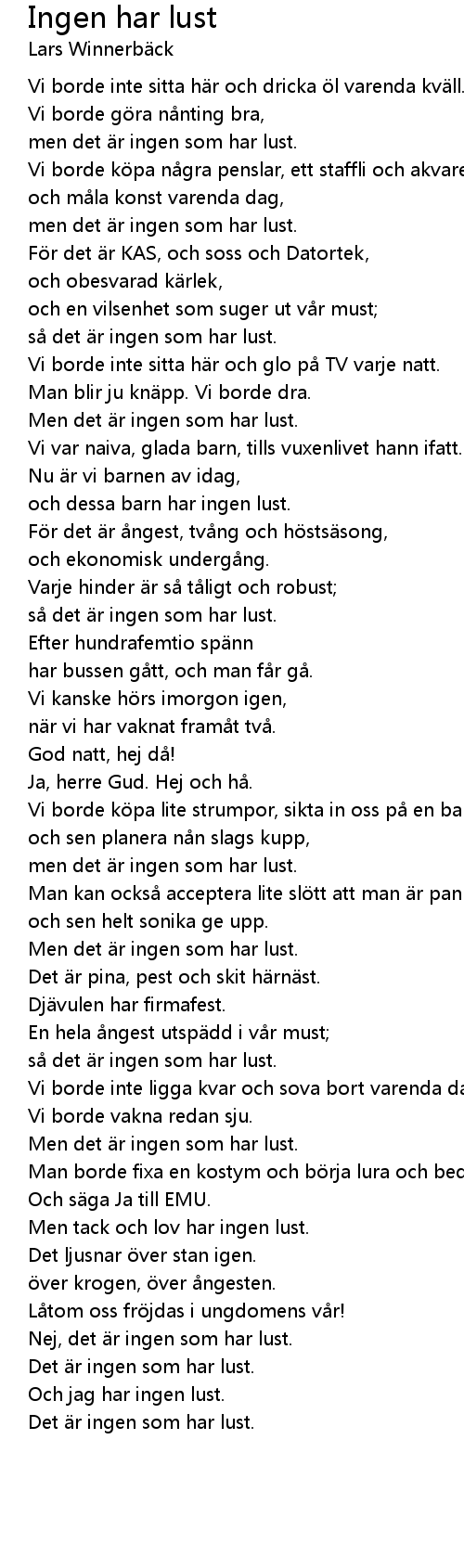 | Vi borde inte sitta h r och dricka l varenda kv ll. | |