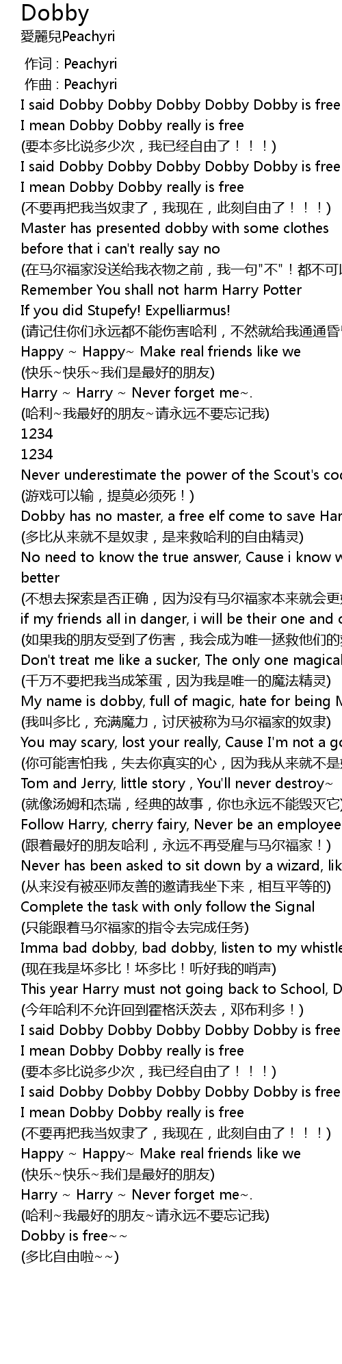 | [00:14.330] | I said Dobby Dobby Dobby Dobby Dobby is free |