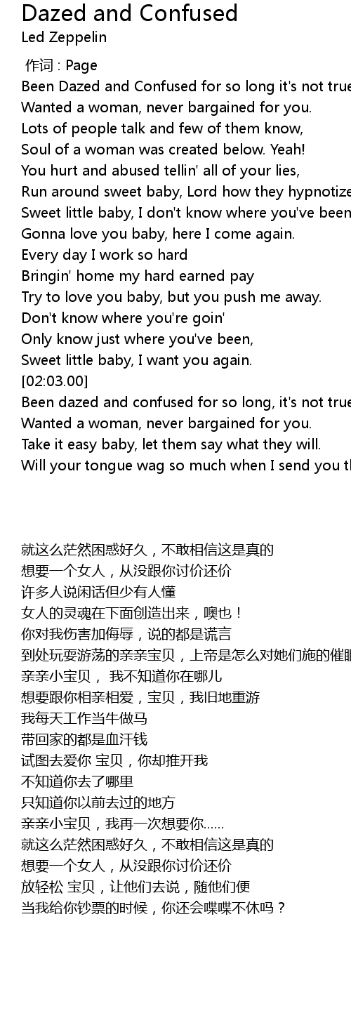 | [00:13.00] | Been Dazed and Confused for so long it's not true, |
