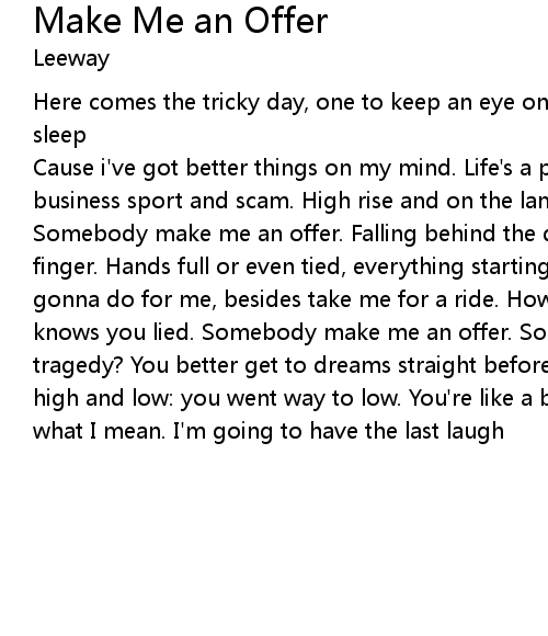 | Cause i've got better things on my mind. Life's a peddling role play, in this business sport and scam. High rise and on the lam any which way you can . Somebody make me an offer. Falling behind the deadline, quick to point the finger. Hands full or even tied, everything starting to linger. So what cha gonna do for me, besides take me for a ride. How ya living you old punk everyone knows you lied. Somebody make me an offer. So you think I should fall like a tragedy? You better get to dreams straight before you wake up. In this game of high and low: you went way to low. You're like a bum with a cup, and you know what I mean. I'm going to have the last laugh |