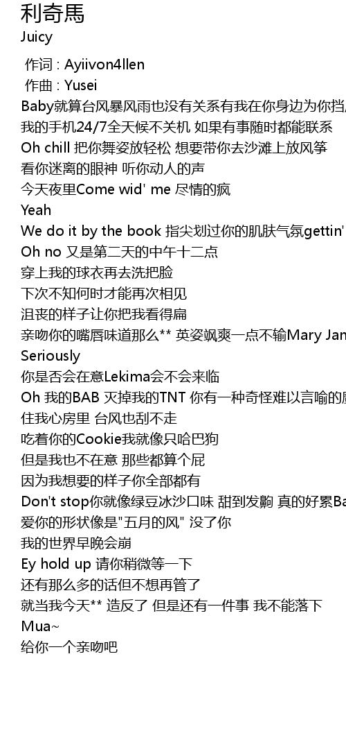 | [01:16.572] | Don't stop你就像绿豆冰沙口味 甜到发齁 真的好累Baby |