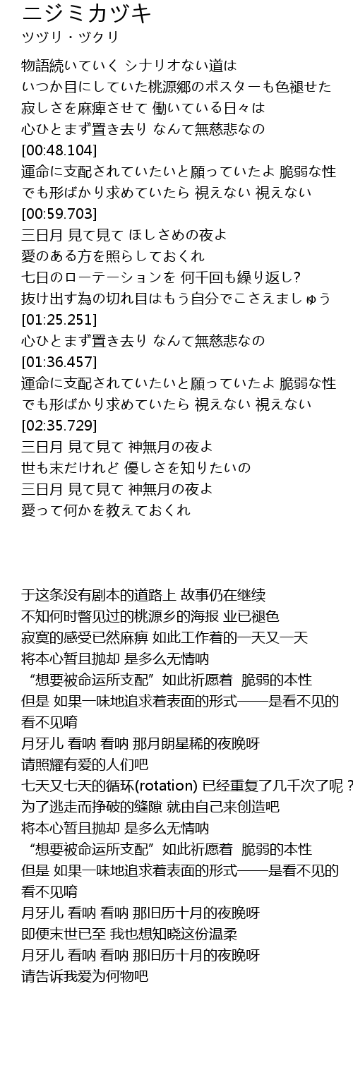 | [01:00.304] | 三日月 見て見て ほしさめの夜よ |