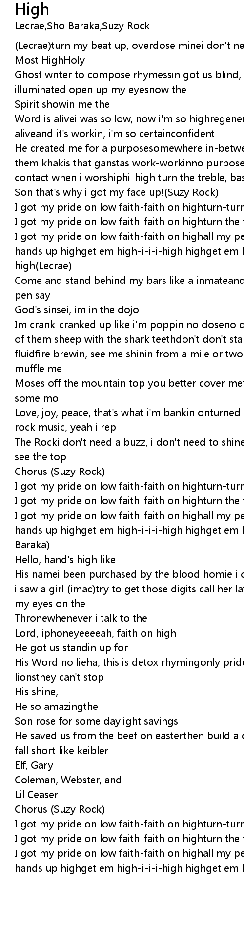 | I got my pride on low faith-faith on highall my people in the building get cha hands up highget em high-i-i-i-high highget em high-i-i-i-high-high, high(Lecrae) | |