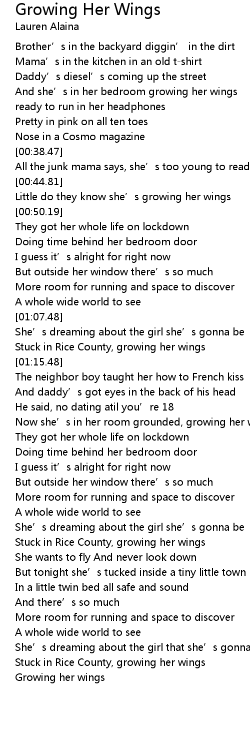| [01:29.95] | Now she’s in her room grounded, growing her wings |
