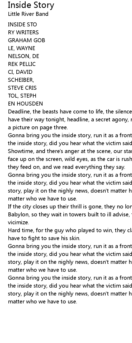 Gonna bring you the inside story, run it as a front page spread, get a load of the inside story, did you hear what the victim said, gonna bring you the inside story, play it on the nighly news, doesn't matter how we get the story, doesn't matter who we have to use. |