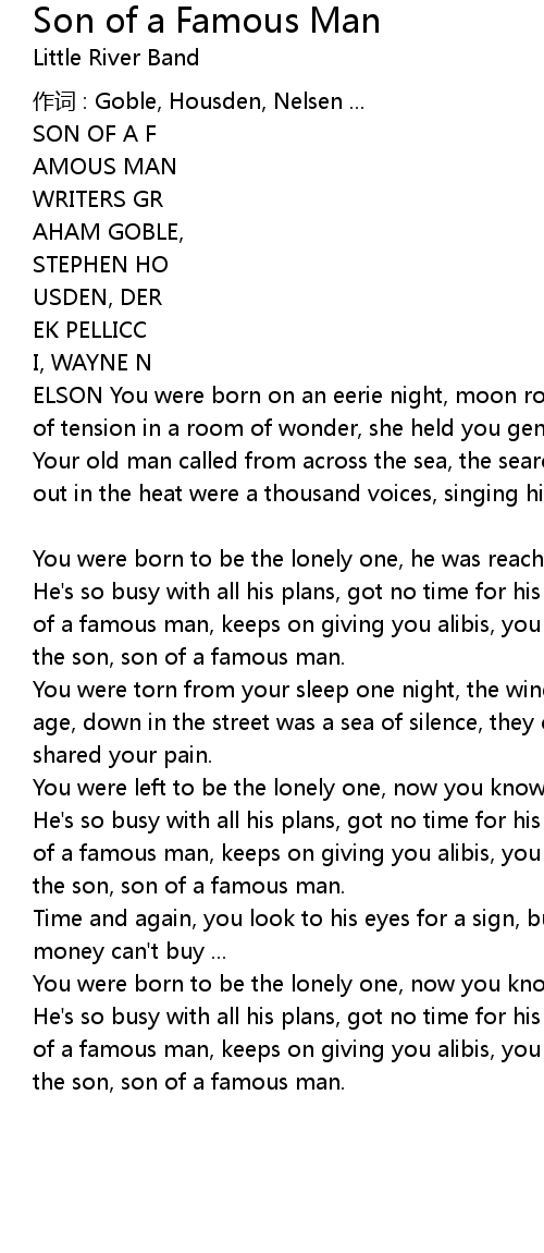 | He' s so busy with all his plans, got no time for his greatest fan, his son, son of a famous man, keeps on giving you alibis, you keep wearing the same disguise, the son, son of a famous man. | |