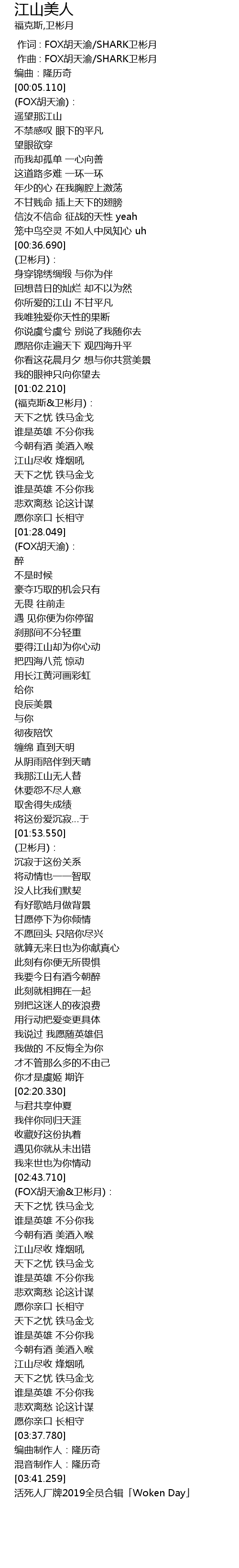| [00:01.000] | zuò qǔ : FOX hú tiān yú SHARK wèi bīn yuè |