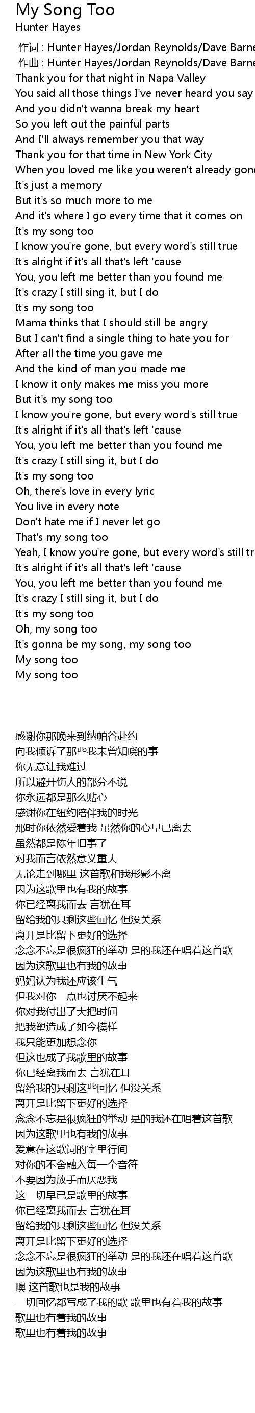 | [00:01.00] | zuo qu : Hunter Hayes Jordan Reynolds Dave Barnes |