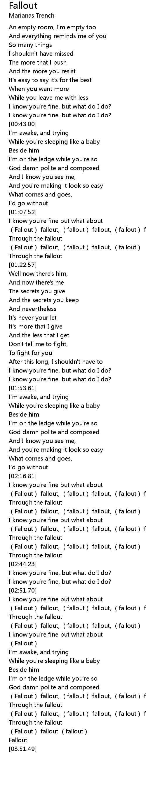 | [03:34.43] | (Fallout) fallout, (fallout) fallout, (fallout) fallout |