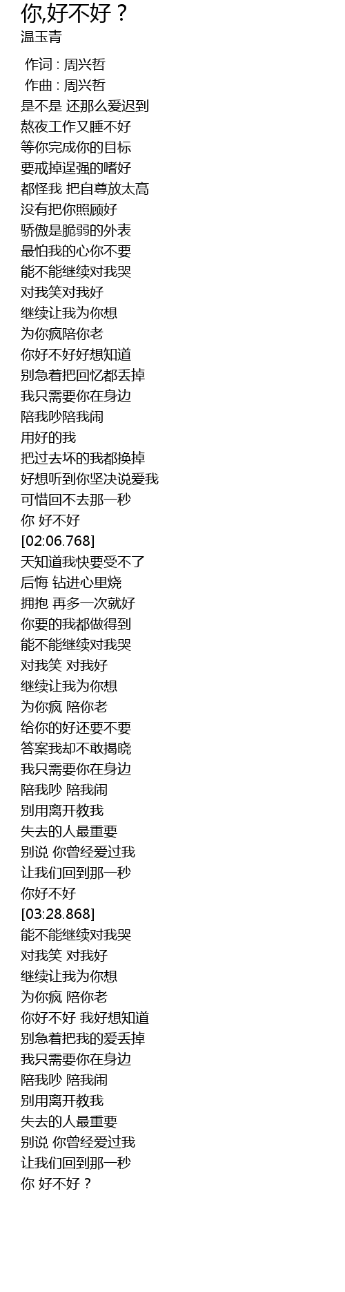 | [03:24.866] | nǐ hǎo bù hǎo |