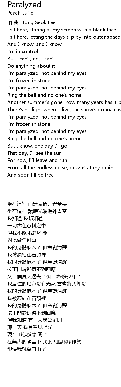 | [02:23.183] | I' m paralyzed, not behind my eyes |