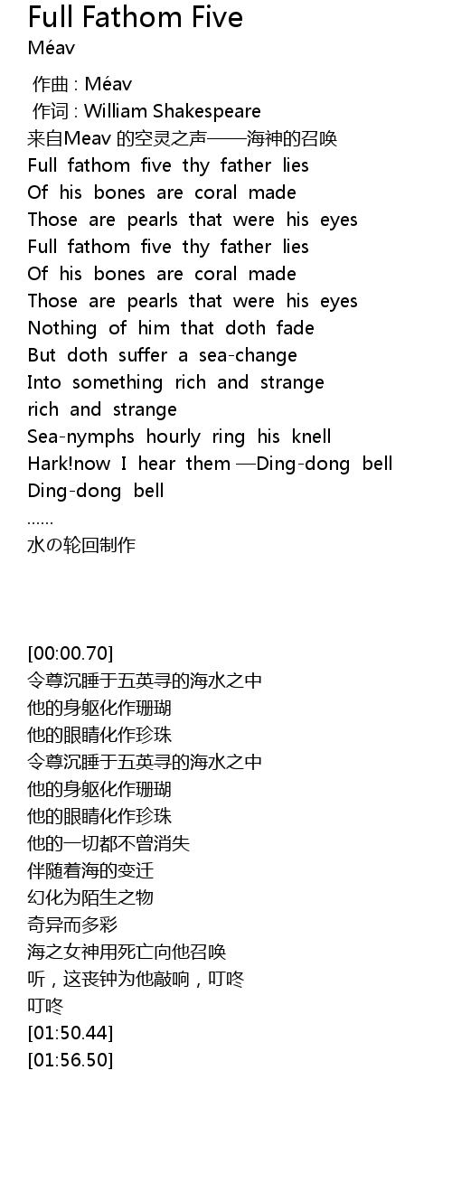 | [01:26.74] | Sea-nymphs hourly ring his knell |