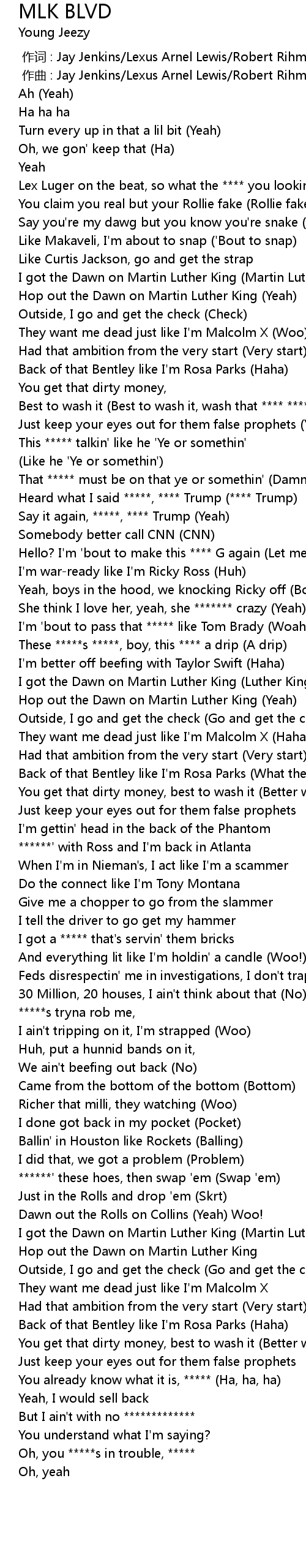 | [01:46.67] | Back of that Bentley like I'm Rosa Parks (What the ****?) |