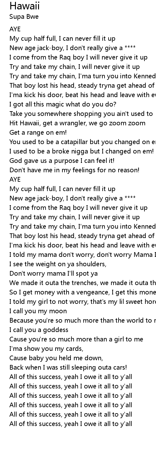 | [00:34.18] | Hit Hawaii, get a wrangler, we go zoom zoom |