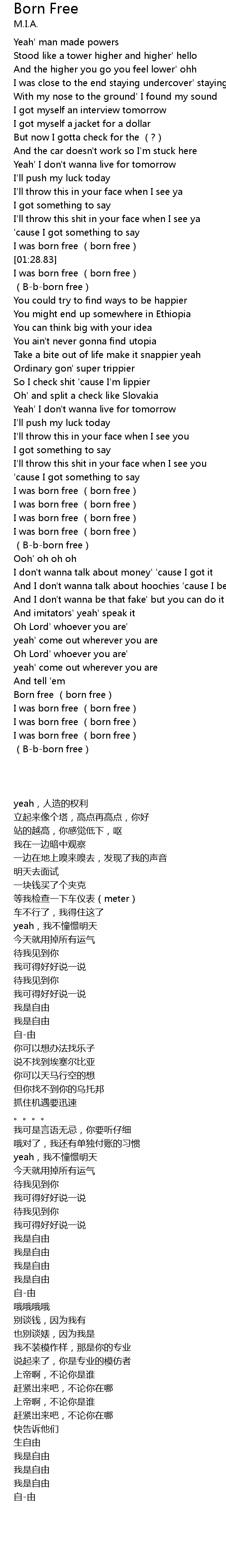 | [03:30.65] | Born free (born free) |