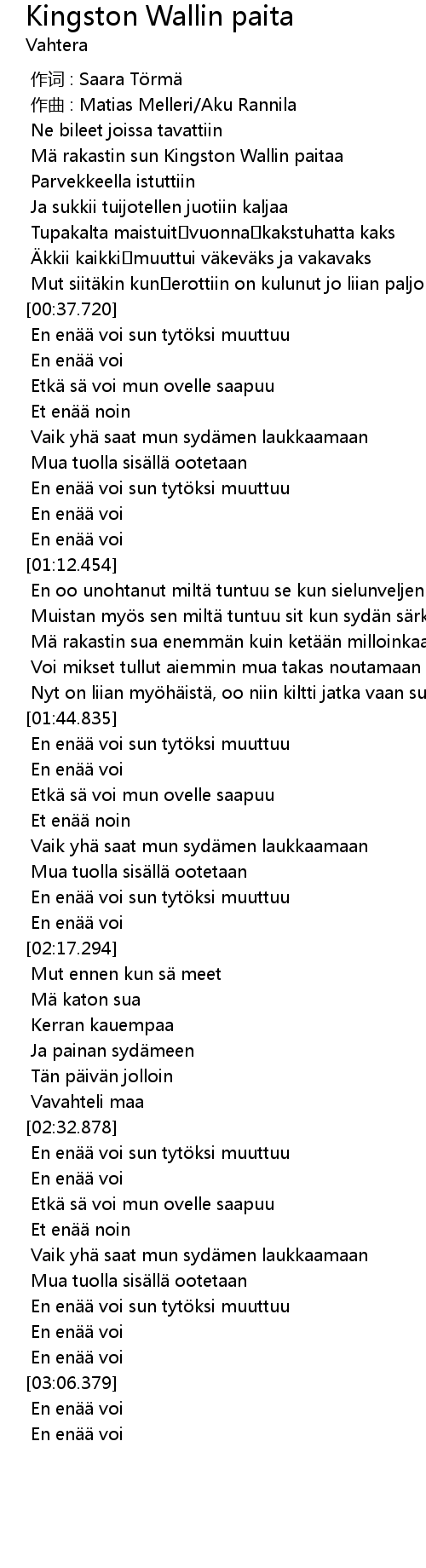 | [02:57.160] | En en voi sun tyt ksi muuttuu |