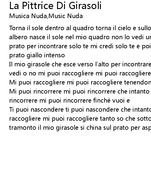 | Il mio girasole che esce verso l'alto per incontrare solo te mi credi solo te lo vedi o no mi puoi raccogliere mi puoi raccogliere usando le tue mani calde | |