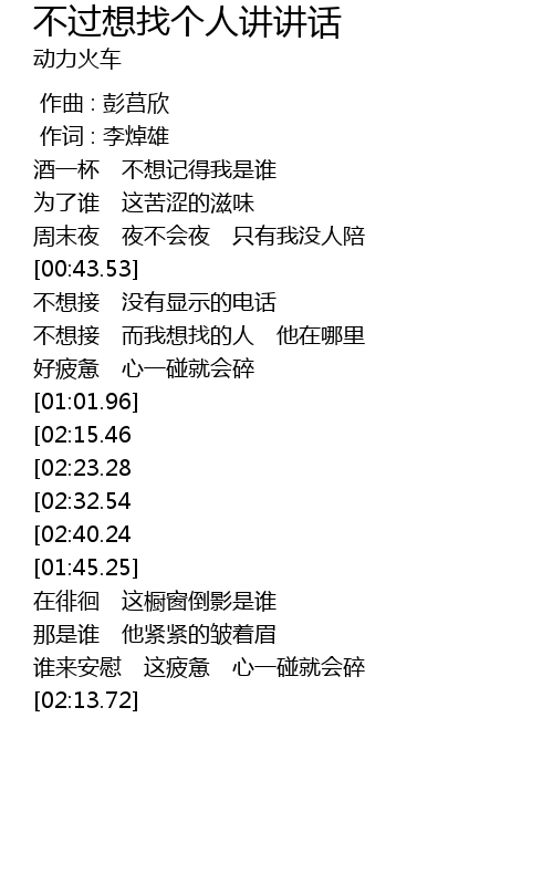 | [03:05.91][02:32.54][01:19.71] | 我不过不过想 找个人讲讲话 |