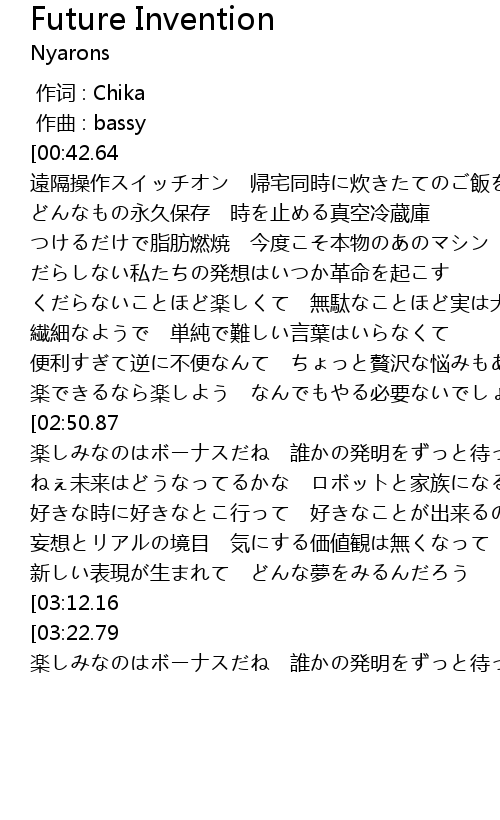 | [03:01.46] | 楽しみなのはボーナスだね 誰かの発明をずっと待って |