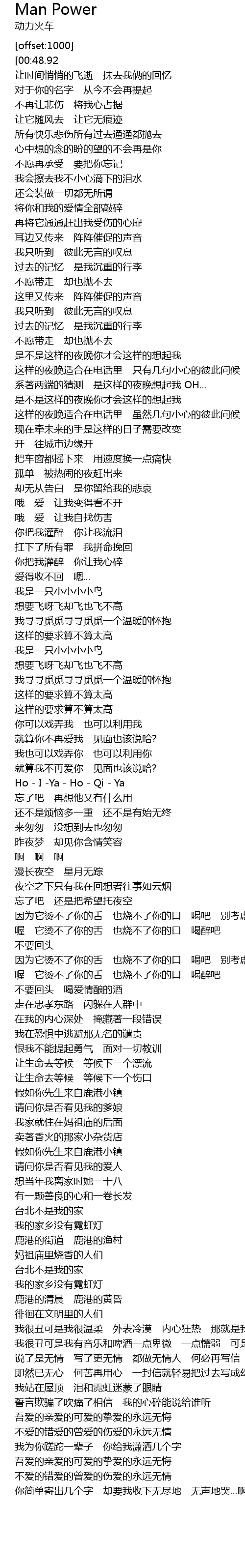 | [00:00.00][00:48.92] | 不要再想你 不要再爱你 |