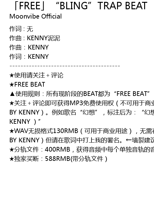 | ★WAV无损格式130RMB(可用于商业用途),无需在歌名后标注(PROD BY KENNY)但请在歌词中打上我的署名。←墙裂建议这种!!! | |