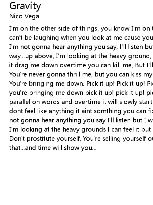 I'm on the other side of things, you know I'm on the other side of things and I can't be laughing when you look at me cause your operating out of jealousy, well I'm not gonna hear anything you say, I'll listen but I won't let it in my way...up above, I'm looking at the heavy ground, I can feel it, but it wont let it drag me down overtime you can kill me, But I'll resurrect so...NANANANANANA You're never gonna thrill me, but you can kiss my ass so NANANANANA woeoooh You're bringing me down. Pick it up! Pick it up! Pick it up! Pick it up! Woeooh you're bringing me down pick it up! pick it up! pick it up! Gravity is a parallel on words and overtime it will slowly start to hurt ya even though it dont feel like anything it aint somthing you can fix with a diamond ring. I'm not gonna hear anything you say I'll listen but I wont let it in my way up above I'm looking at the heavy grounds I can feel it but it wont let it drag me down. Don't prostitute yourself, You're selling yourself out, You're a better man than that...and time will show you... |