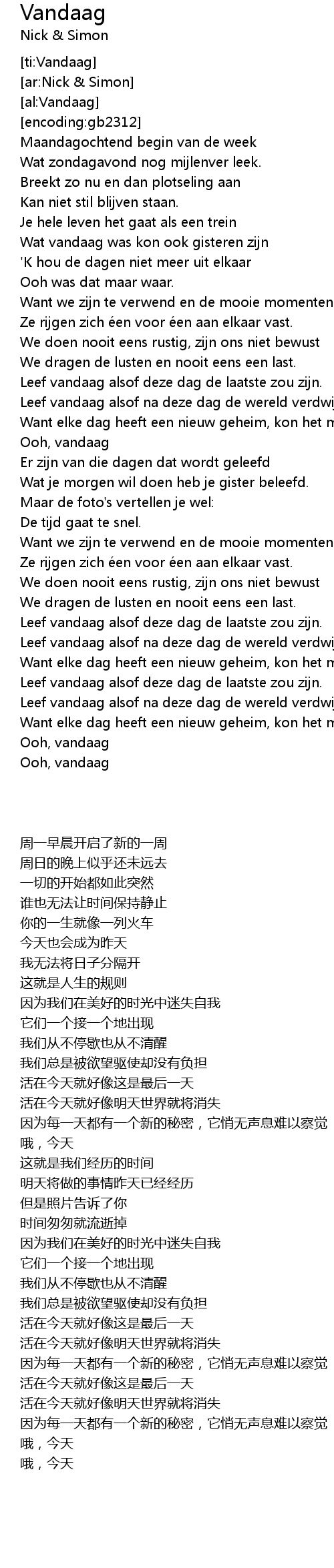| [02:28.38] | Leef vandaag alsof deze dag de laatste zou zijn. |