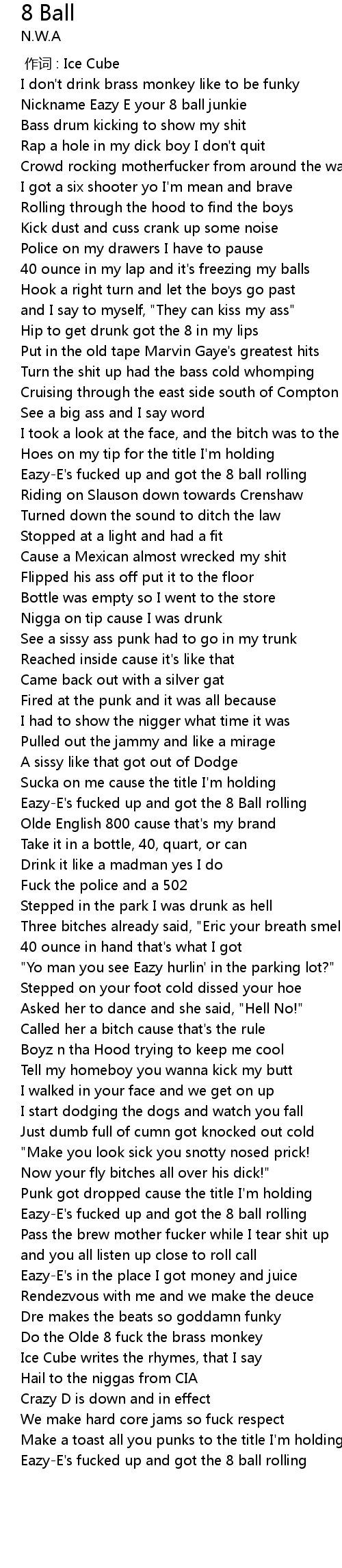 | [02:19.22] | EazyE' s fucked up and got the 8 Ball rolling |