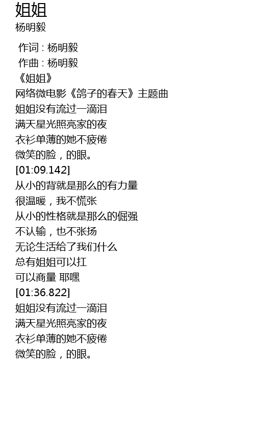 | [01:42.322] | 姐姐没有流过一滴泪 |