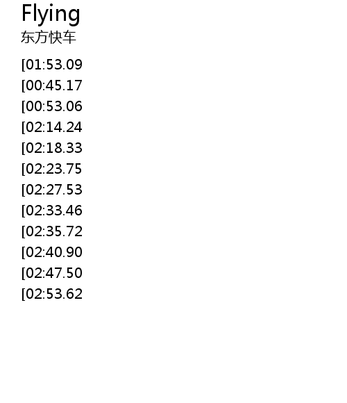 | [04:09.92][02:53.62][01:38.13] | Flying Flying Flying |