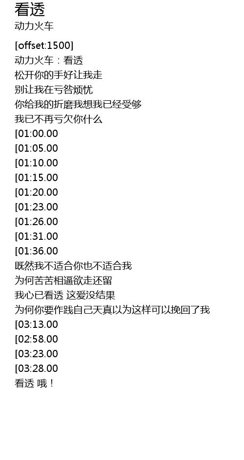 | [03:43.00][03:23.00][03:02.00] | kàn tòu ràng xīn qíng qīng sōng |