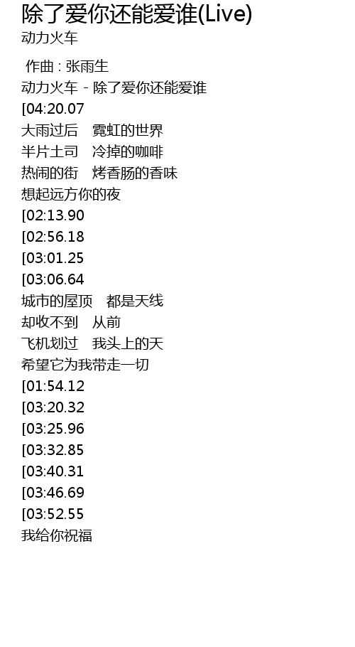 | [00:01.00] | 动力火车 - 除了爱你还能爱谁 |