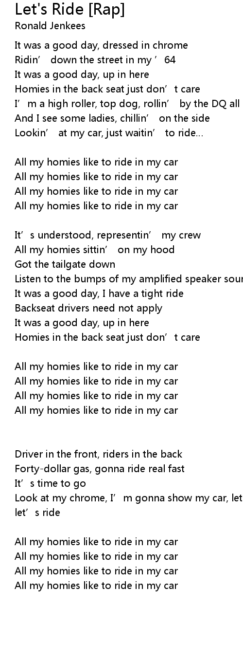 | Look at my chrome, I' m gonna show my car, let' s ride, | |