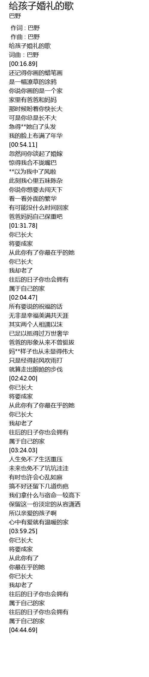 | [00:05.23] | 给孩子婚礼的歌 |