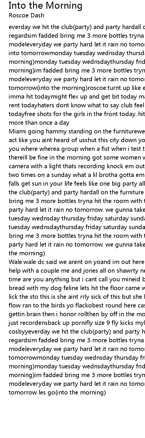 Wale:wale dc said we arent on yoand im out here were gunna accept with a lil help with a couple me and jones all on shawrty needs a punchoand thats all the time are you anything but i cant call you mineid be lyin yall be fine chase bread with my dog feline lets hit the floor came with one but i did itt with 4 lick the sto this is she aint rrly sick of this but she let me-e-eethats roscoe flow ran to the birds yo flackobest round here case yall dont know. when im dont gettin brain then i honor rollthen by off in the morning i dont no these (?) im just recordensback up pornifly size 9 fly kicks mybody dimes ill sweater bill cosbyyeverday we hit the club(party) and party hardall on the furniture with no regardsim fadded bring me 3 more bottles tryna hit the room with this bad lil modeleveryday we party hard let it rain no tomorrowwe gunna take this party into tomorrowmonday tuesday wednsday thursday friday saturday sunday (into the morning)monday tuesday wednsdaythursday friday saturday sunday (into the morning)im fadded bring me 3 more bottles tryna hit the room with this bad lil modeleveryday we party hard let it rain no tomorrowwe gunna take this party into tomorrow les go(into the morning) |