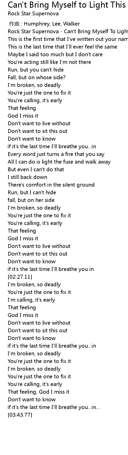 | [00:02.00] | Rock Star Supernova Can' t Bring Myself To Light This Fuse |