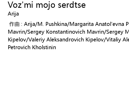 | [00:00.00-1] | zuò qǔ : Arija M. Pushkina Margarita Anatol' evna Pushkina S. Mavrin Sergey Konstantinovich Mavrin Sergey Mavrin V. Dubinin V. Kholstinin V. Kipelov Valeriy Aleksandrovich Kipelov Vitaliy Alekseevich Dubinin Vladimir Petrovich Kholstinin |