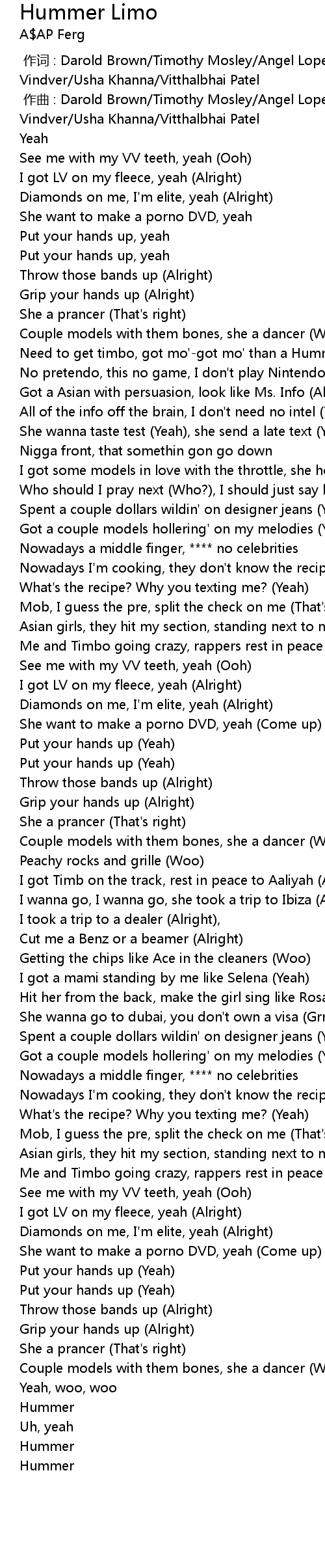 | [00:29.55] | Need to get timbo, got mo'-got mo' than a Hummer limo (Yeah) |