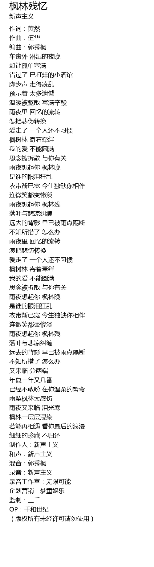 | [01:32.47] | 雨夜想起你 枫林残 |