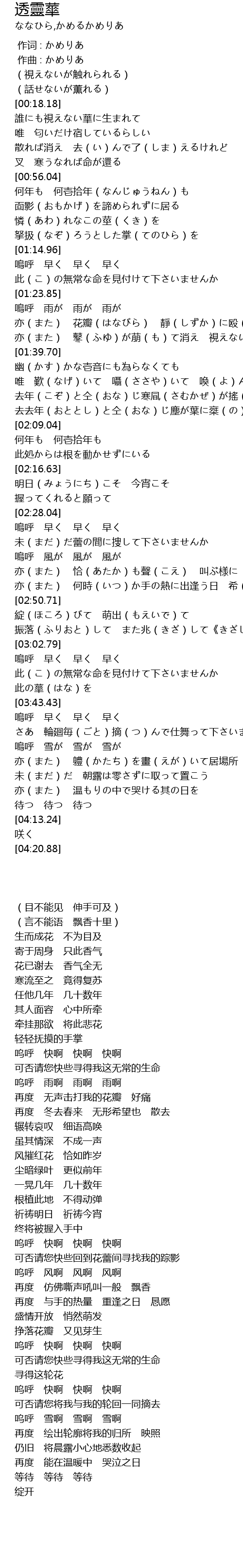 | [01:31.15] | 亦(また) 鼕(ふゆ)が萠(も)て消え 視えない希望も散る |
