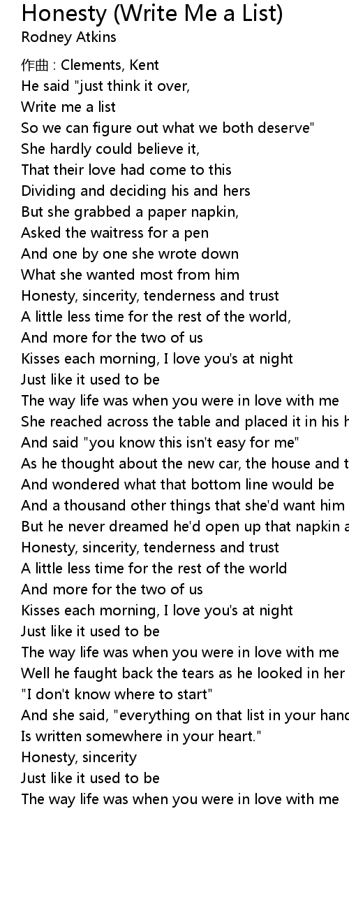 | Song | Honesty (Write Me a List) |