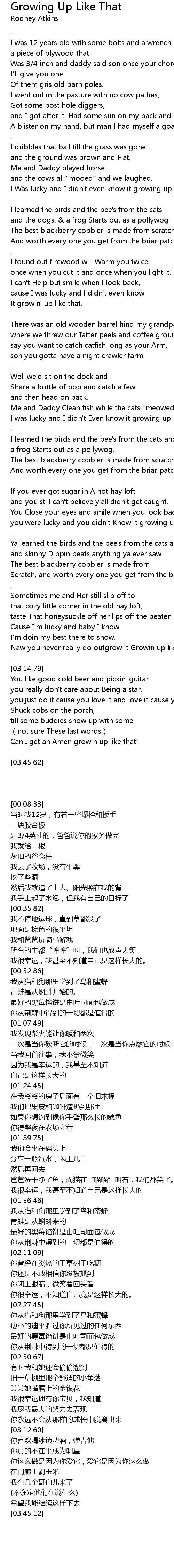 | [00:16.15] | Was 3 4 inch and daddy said son once your chores are one |
